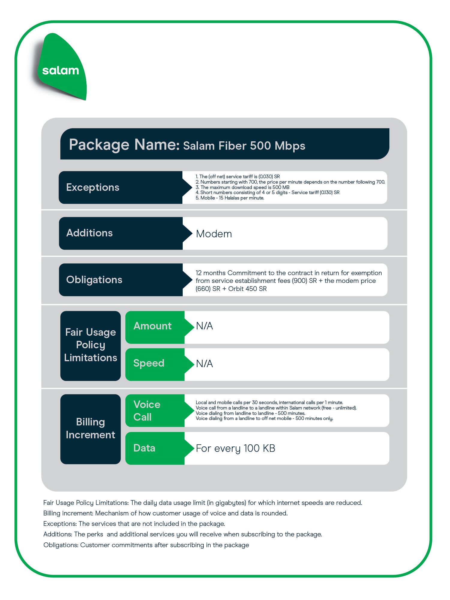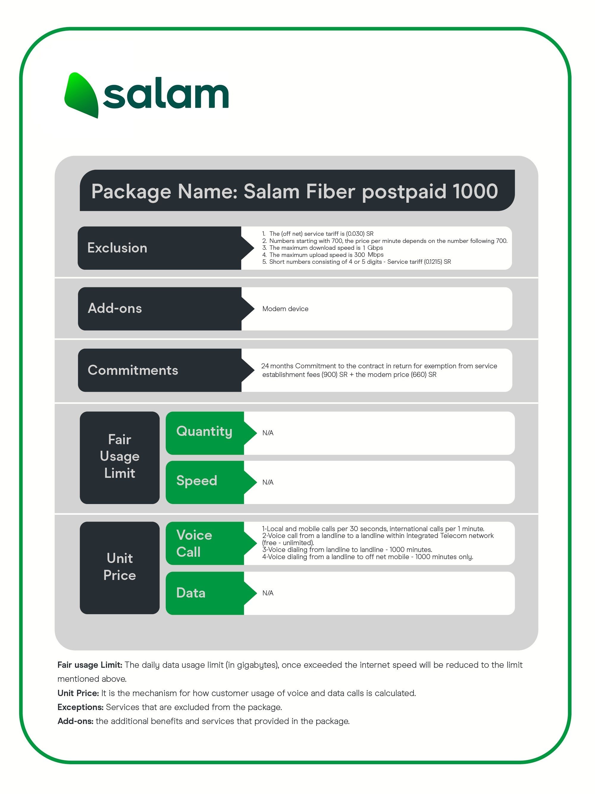 Salam Fiber Fixed voice service & free minutes are only available in supported areas.